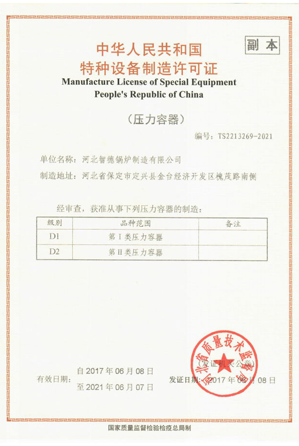 經(jīng)審查,獲準(zhǔn)從事第Ⅰ類壓力容器和第Ⅱ類壓力容器的制造。